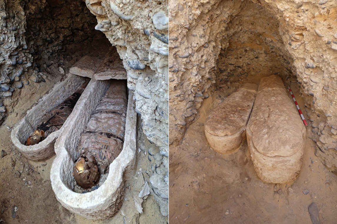 The excavation produced several mummies dating to the Roman era, some wrapped in linen bandages decorated with geometric motifs, alongside wooden sarcophagi. The team also recovered three gold tongue amulets and one made of copper, as well as evidence of gold leaf applied to certain mummies.
